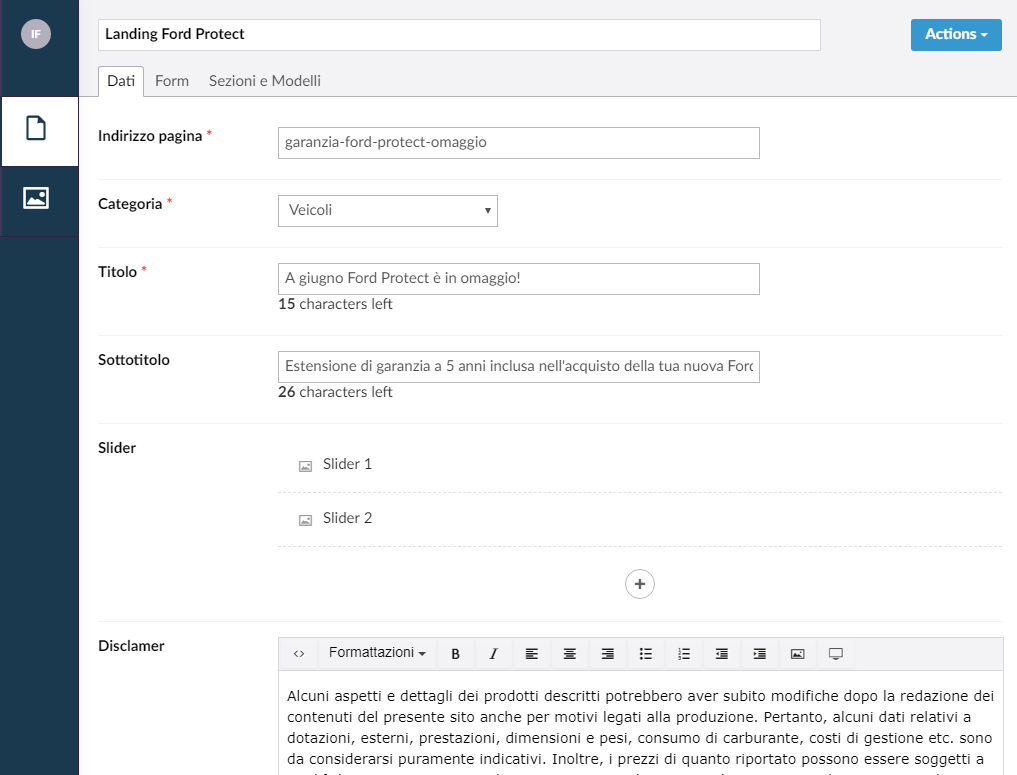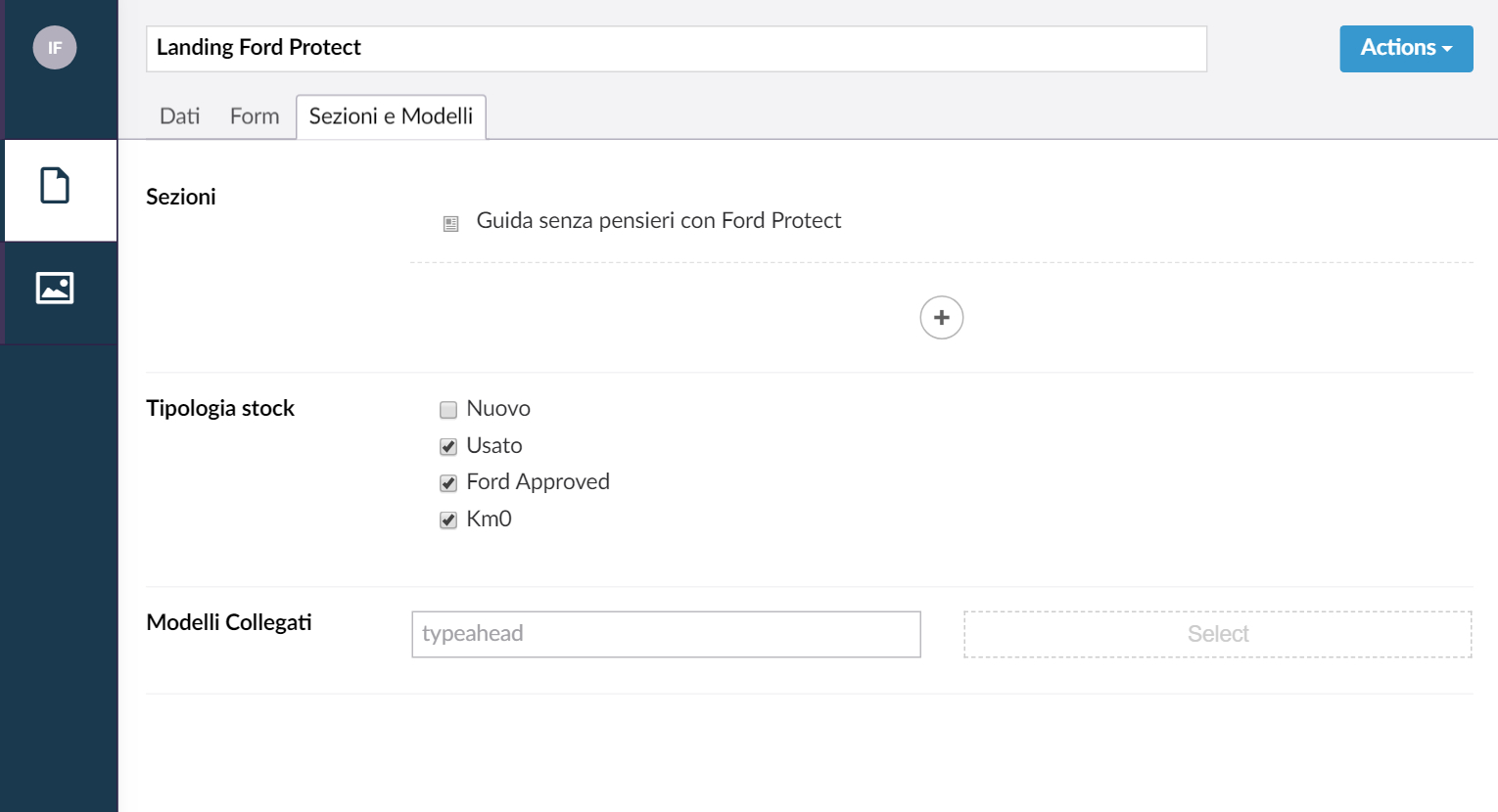 Tipologia stock: In questo campo selezionate gli argomenti che coinvolgono la landing page: Nuovo, Usato, Ford Approved e Km 0.