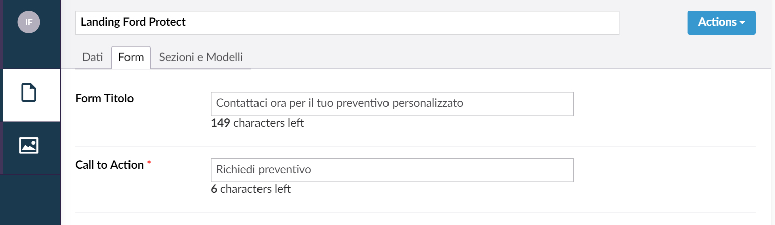 Sezioni: In questa sezione si inseriscono i dettagli della landing page Per inserire l’immagine è necessario selezionarla e cliccare sul campo submit in basso a destra rispettando le dimensioni richieste (767x431).