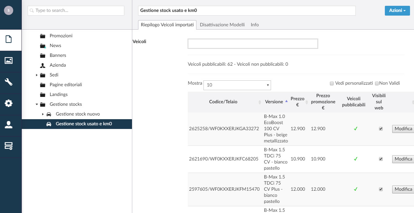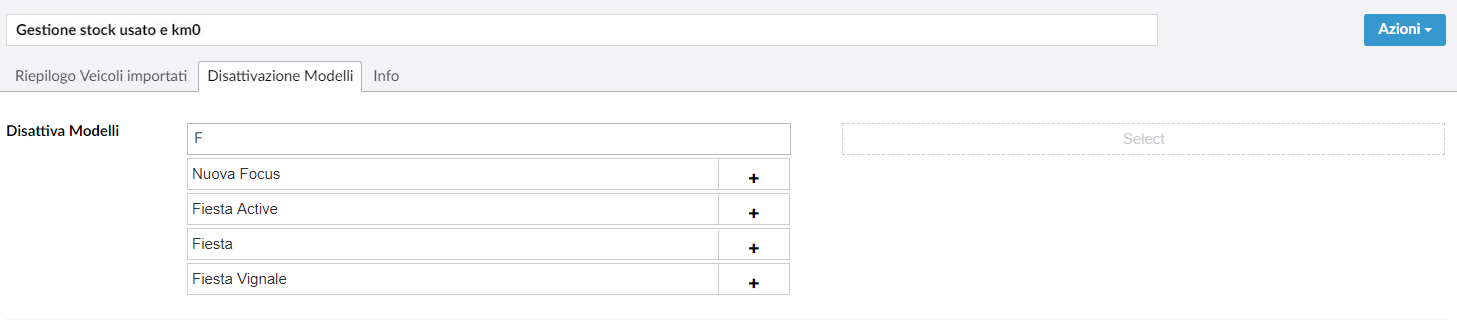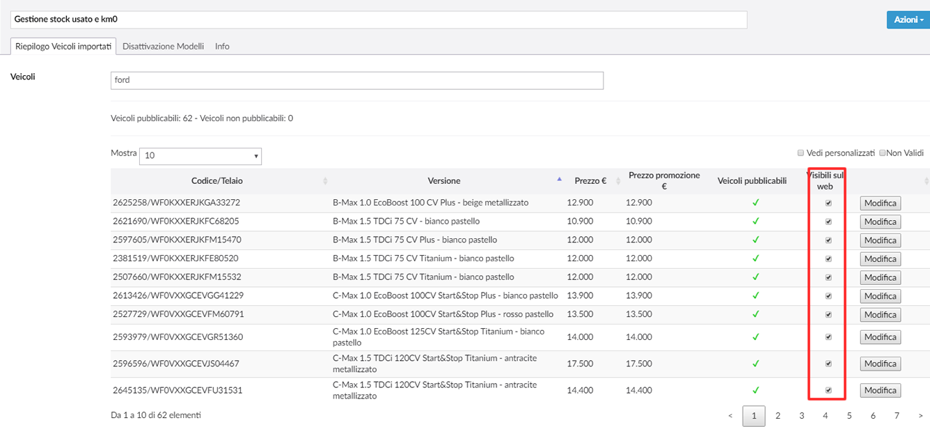 Selezionando un modello è possibile disattivare la pubblicazione di tutte le vetture che comprendo la car-line scelta