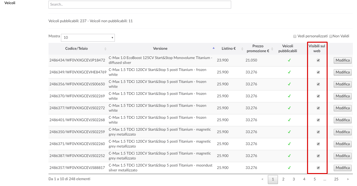 La colonna “Visibili sul web” indica le vetture pubblicate e visibili sul Dealer Web Site Ford.