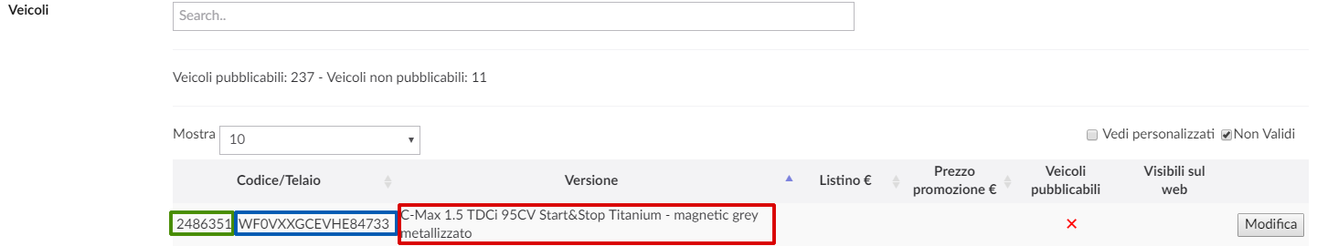 Per una rapida visualizzazione di queste auto basta utilizzare il Flag “Non Validi” in questo modo è possibile visualizzare solo le automobili non pubblicate.