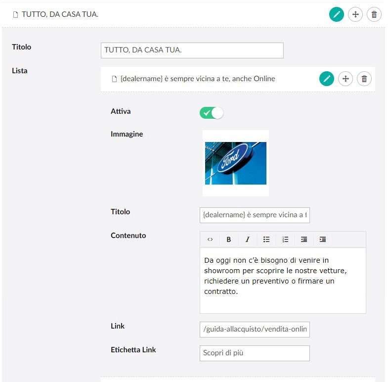 Cliccando sulla sezione Chi siamo si apre il menù con il quale si accede alle label Dati e Sezioni Editoriali. Cliccando sulla label Chi siamo, dal campo Immagine, possiamo inserire un’immagine che rappresenta la concessionaria. Il resto del testo ...