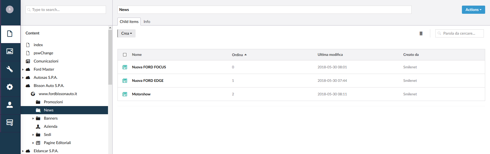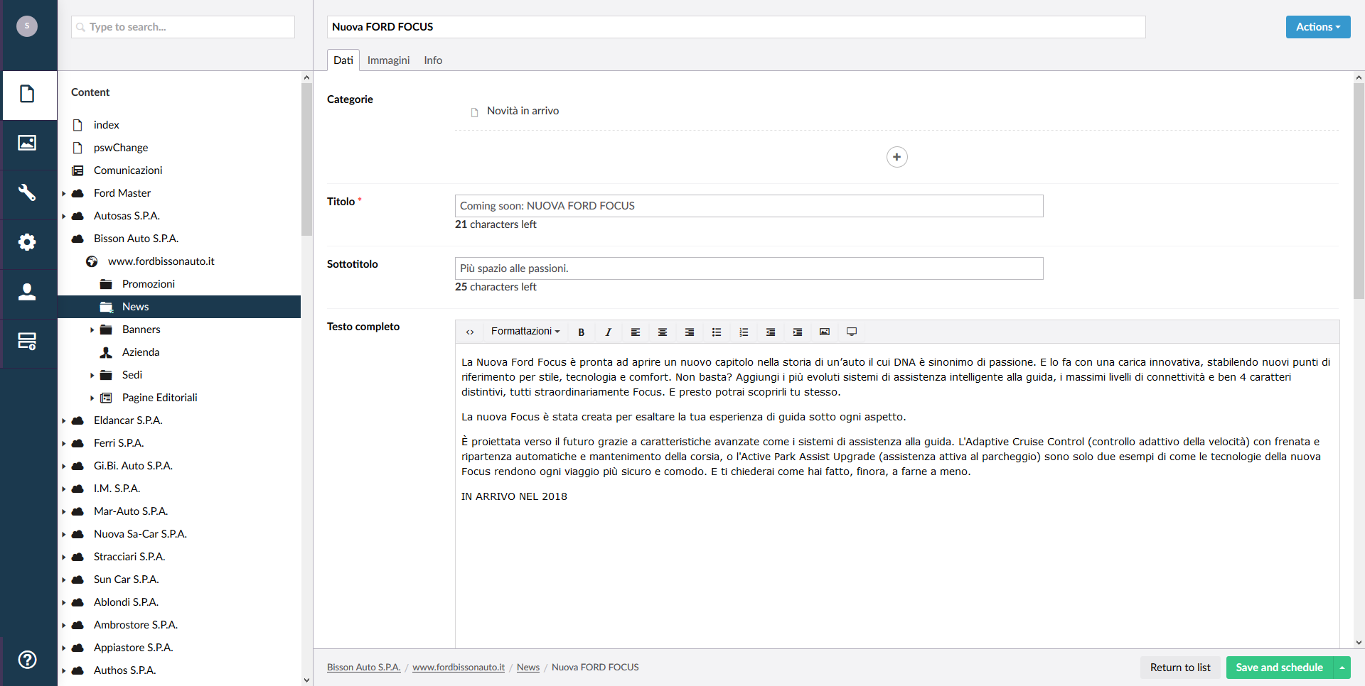 Cliccando su crea si apre il menù crea news con il quale si accede alle label Dati e Immagini: