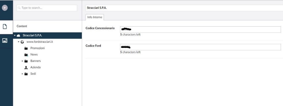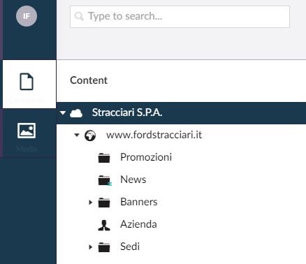 La sezione contenuto è visualizzata di default con una struttura ad albero classificata con una nuvola su cui appare la ragione sociale del dealer e di seguito in basso le sezioni modificabili direttamente dall’utente: Promozioni, News, Banners, Azienda, Sedi.