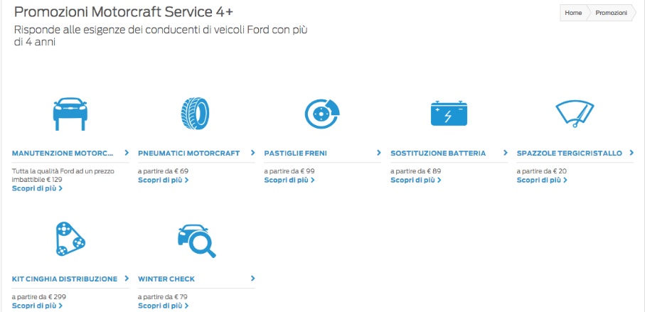 La sezione Motorcraft Service 4+ sono divise per categorie: Manutenzione Motore, Pneumatici, Pastiglie freni, Sostituzione Batterie, Spazzole tergicristallo, Cinghia Distribuzione, Winter Check.