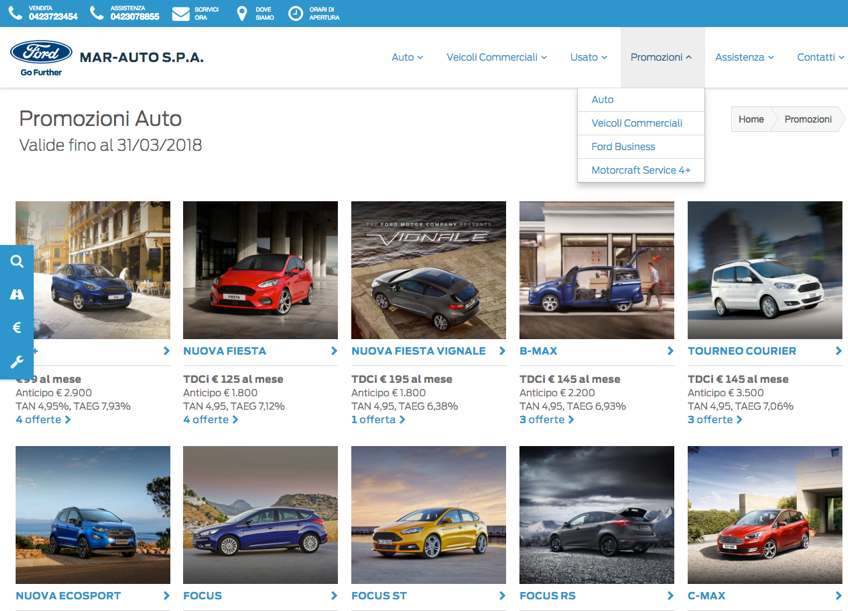 Il menù promozioni viene aggiornato con cadenza periodica da Ford Italia ed è diviso in più sottomenù. I principali sono: