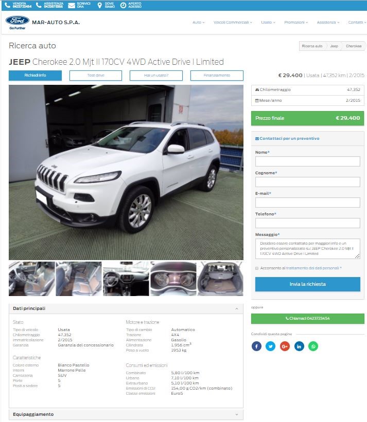 Cliccando sulla singola vettura è possibile entrare nella VDP, Vehicle Detail Page dove viene mostrata una descrizione più dettagliata della vettura arricchita da uno scroll semiautomatico di fotografie. La VDP illustra i dati principali del veicolo, caratteristiche tecniche, equipaggiamenti di serie e optional, il prezzo promozionato e i form per alimentare la CTA (come ad esempio l’invio della richiesta del preventivo o la richiesta di contatto telefonico).