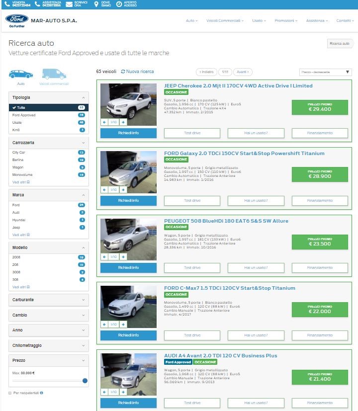 Il menù usato mostra l’elenco dei veicoli disponibili in stock che si possono selezionare grazie a molteplici filtri di ricerca: tipologia, carrozzeria, marca, modello, carburante, cambio, anno, chilometraggio, prezzo. In alto a destra è presente il filtro per cambiare la modalità di visualizzazione dell’elenco delle vetture che possono essere ordinate per prezzo (crescente o decrescente), modello (in ordine alfabetico) o per chilometraggio (crescente o decrescente).